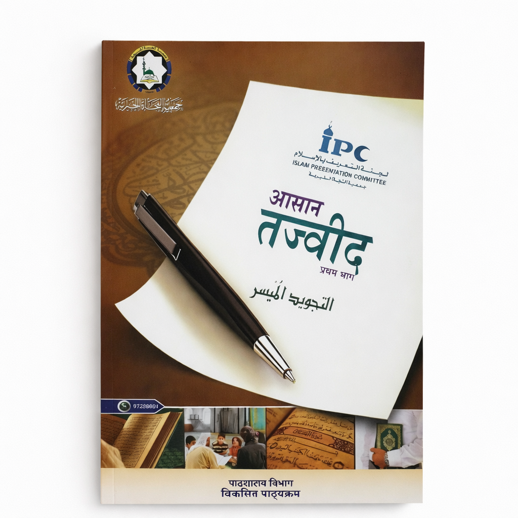 كتاب تعليمي مبسّط يعرّف بقواعد التجويد الأساسية، مناسب للمبتدئين ومتعلّمي اللغة الهندية.